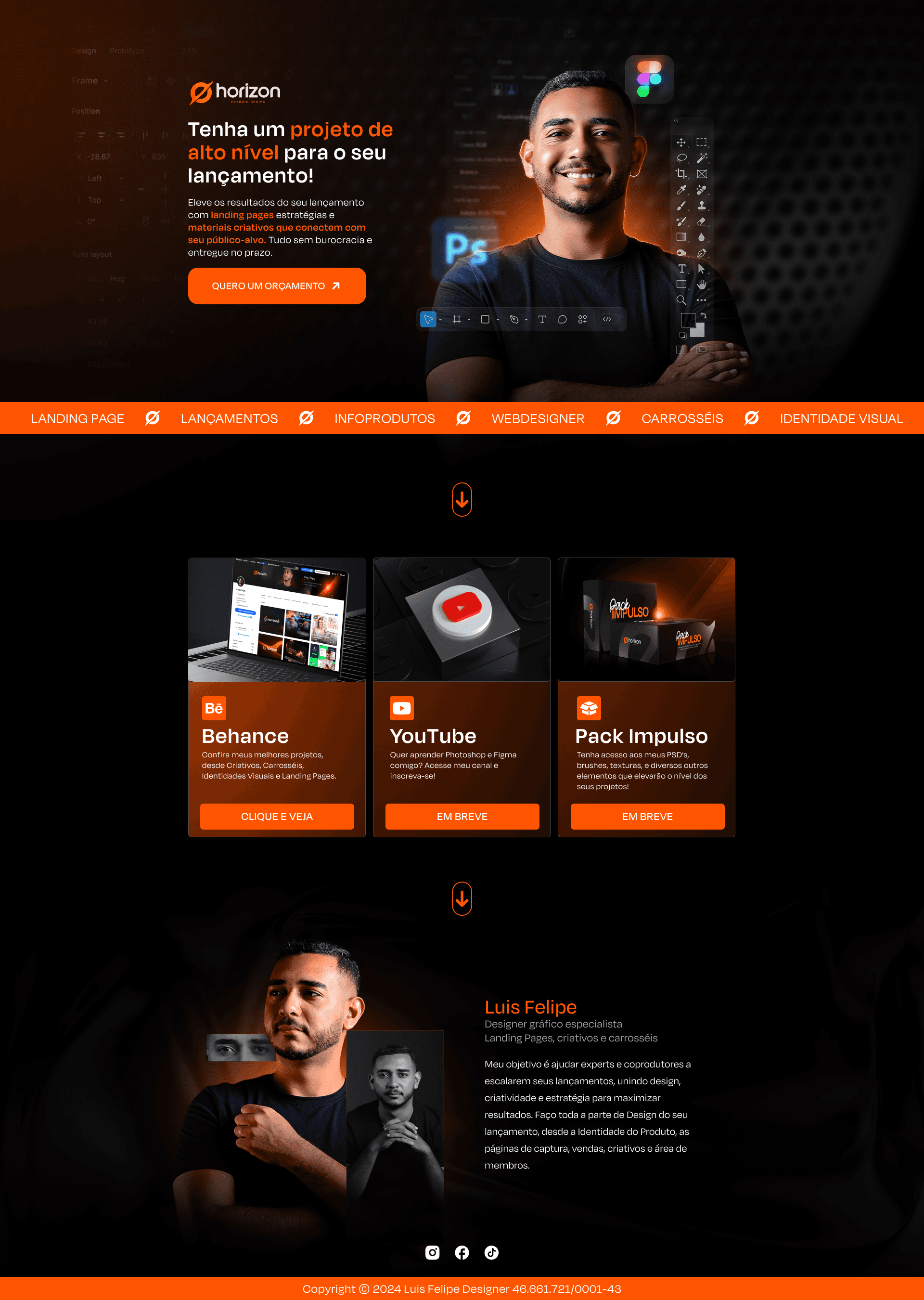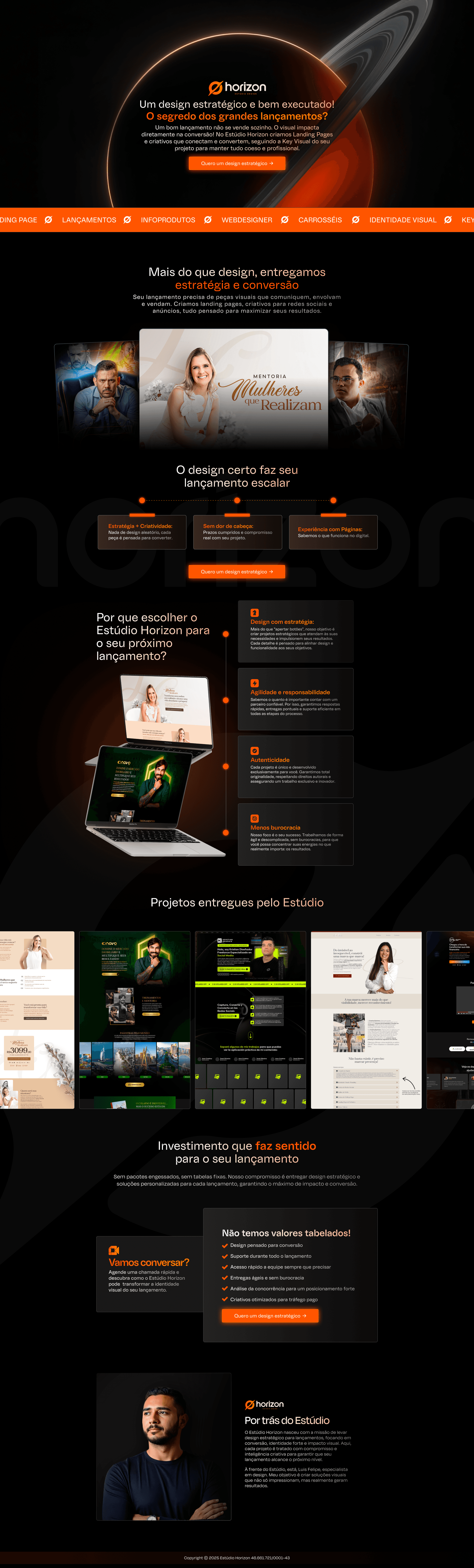 O Estúdio Horizon nasceu com a missão de levar design estratégico para lançamentos, focando em conversão, identidade forte e impacto visual. Aqui, cada projeto é tratado com compromisso e inteligência criativa para garantir que seu lançamento alcance o próximo nível.